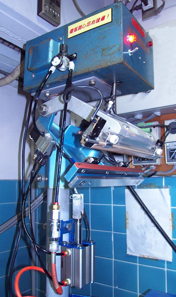 自動シーラー1と同様に、富士インパルスシーラーにエアーシリンダーと自動回路を組込みました。