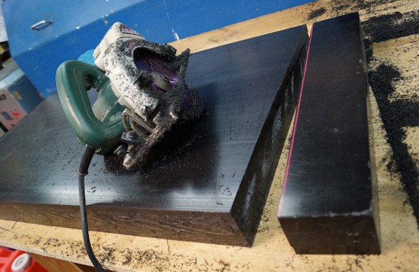まずは大雑把に丸鋸でブロック2つを切り出します。
